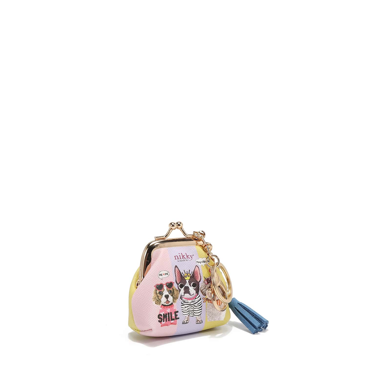 - Pouch: Made of eco-leather. Main zipper closure. Gold hardware zipper pull with tassel. Nikky print front and back. Nikky logo nameplate.