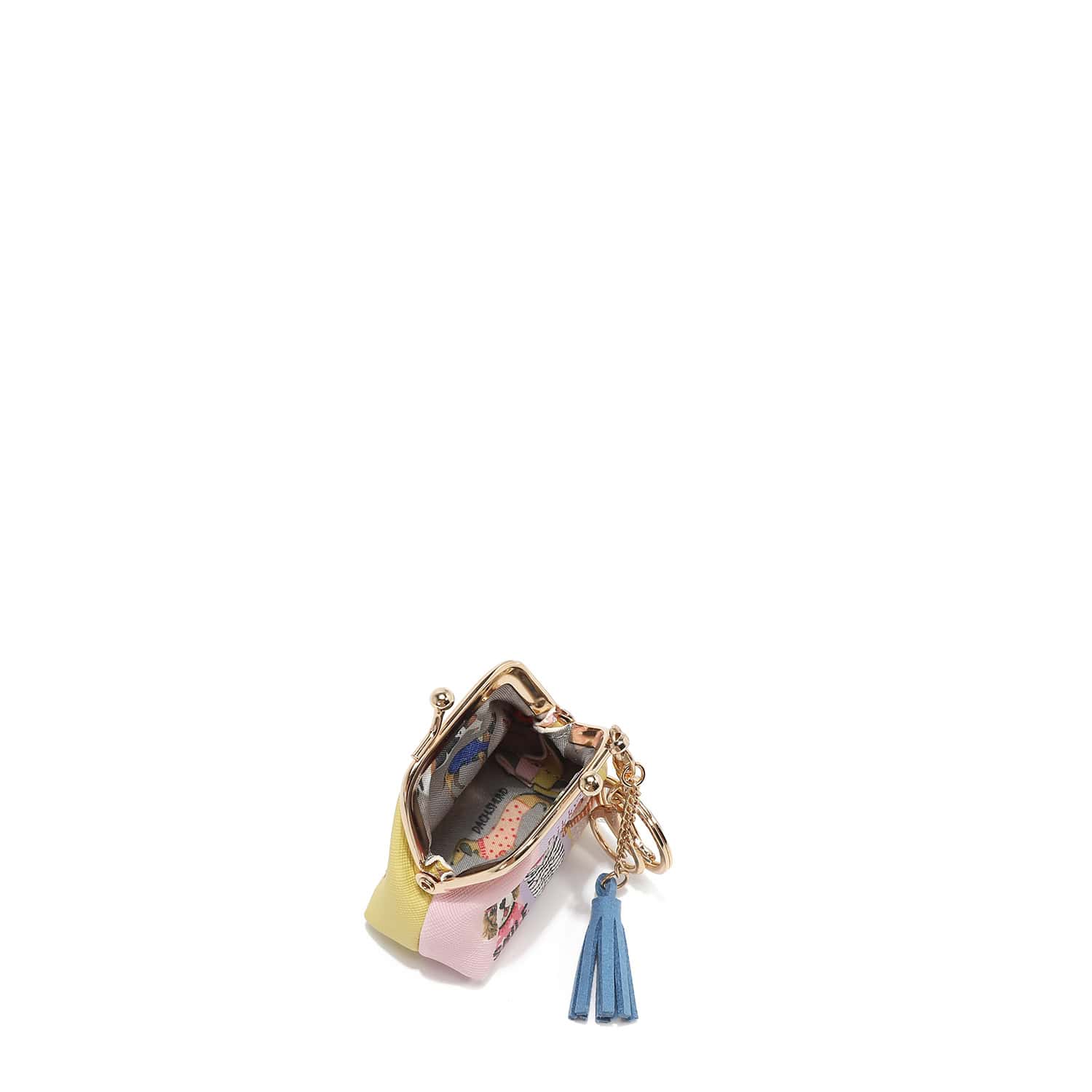 - Coin Purse: Made of eco-leather. Kiss-lock closure. Key ring and lobster claw clasp in gold-tone hardware. 2.5” inch gold-tone chain with a tassel hanging.