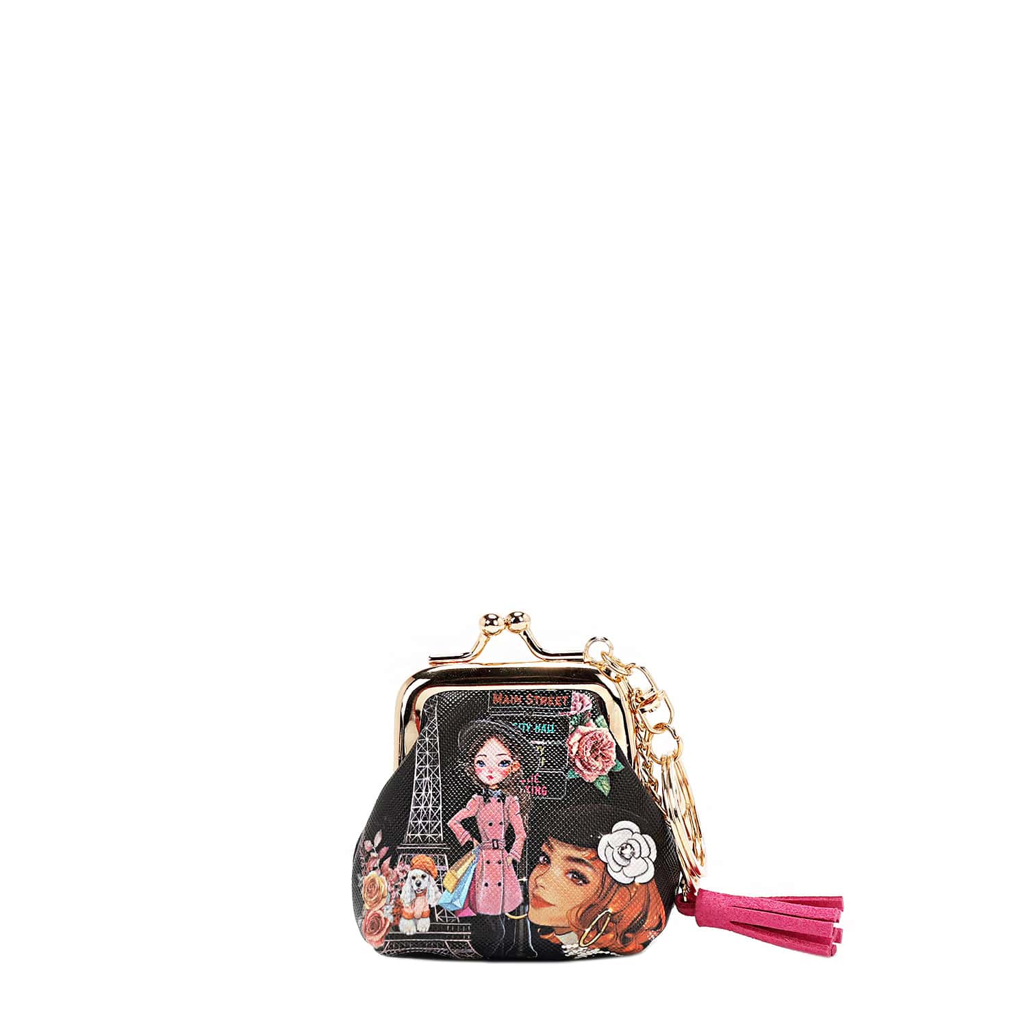 - Coin Purse: Made of eco-leather. Kiss-lock closure. Key ring and lobster claw clasp in gold-tone hardware. 2.5” inch gold-tone chain with a tassel hanging.
