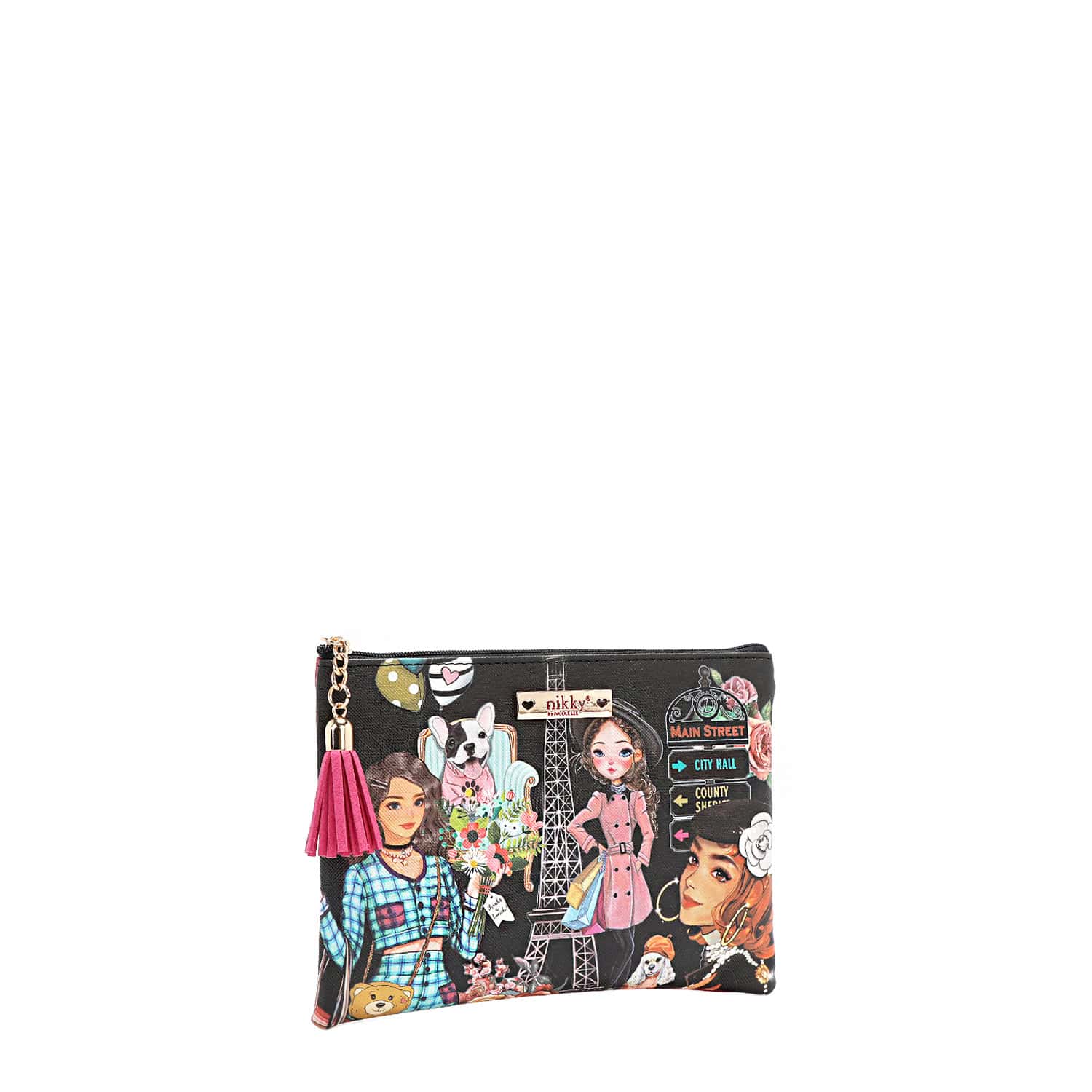 - Pouch: Made of eco-leather. Main zipper closure. Gold hardware zipper pull with tassel. Nikky print front and back. Nikky logo nameplate.