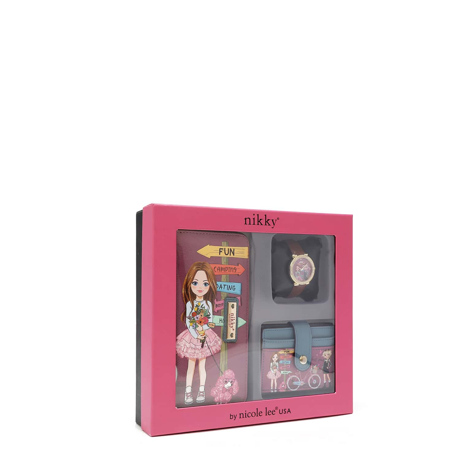 Looking for a great gift ? Treat your loved ones with our 3 piece gift set that can be styled together or separately. This set includes 1 double zippered wallet, 1 bifold card case and a classic chic diamond watch in our exclusive premium prints.