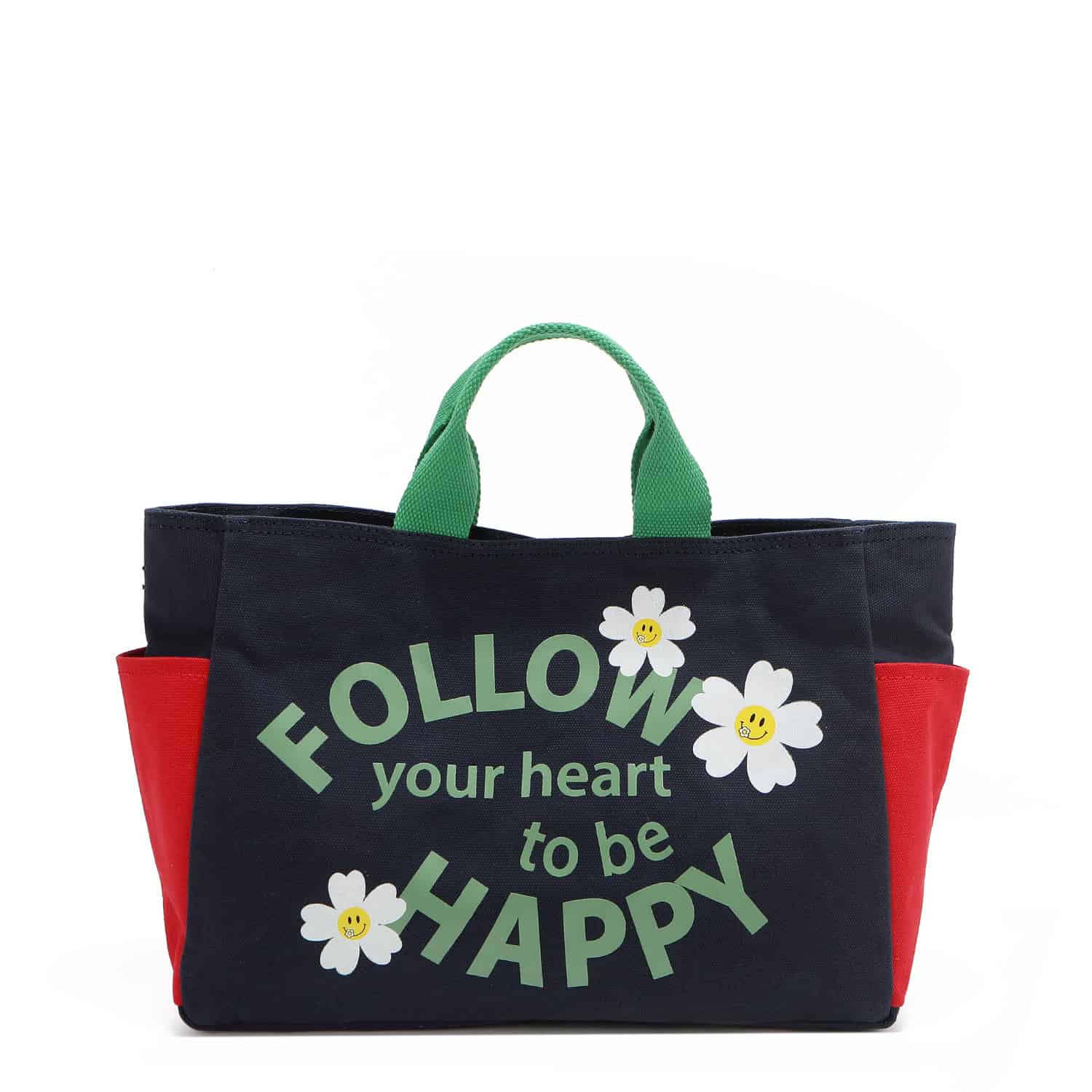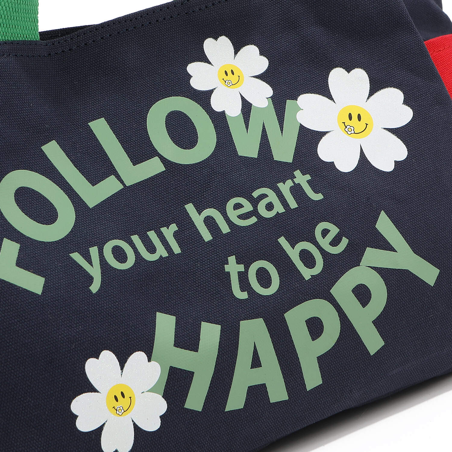 Your new everyday essential with a happiness boost! Elodie features handy side pockets and a spacious interior—perfect for your notebooks, wallet, snacks, and more. With its “Follow Your Heart to Be Happy” message and glittery floral smiley accents, this roomy bag is designed to bring bliss wherever you go!